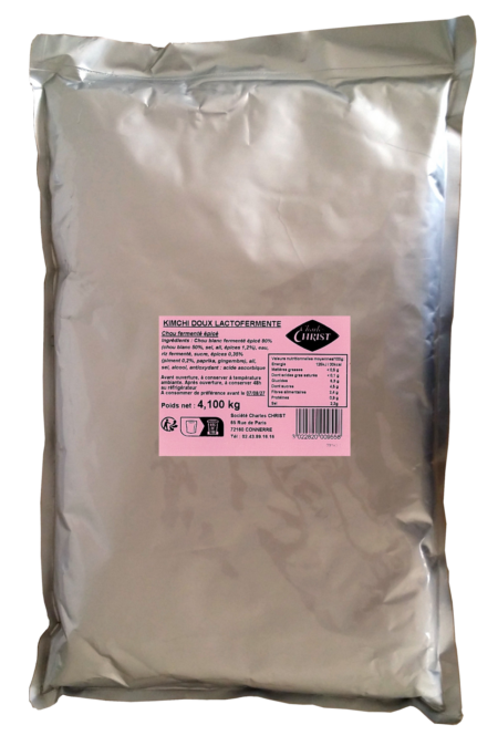 Chou blanc fermenté épicé 80% (chou blanc 50% - France, sel, ail, épices 1,2%), eau, riz fermenté, sucre, épices 0,35% (piment 0,2%, paprika, gingembre), ail, sel, alcool, antioxydant : acide ascorbique