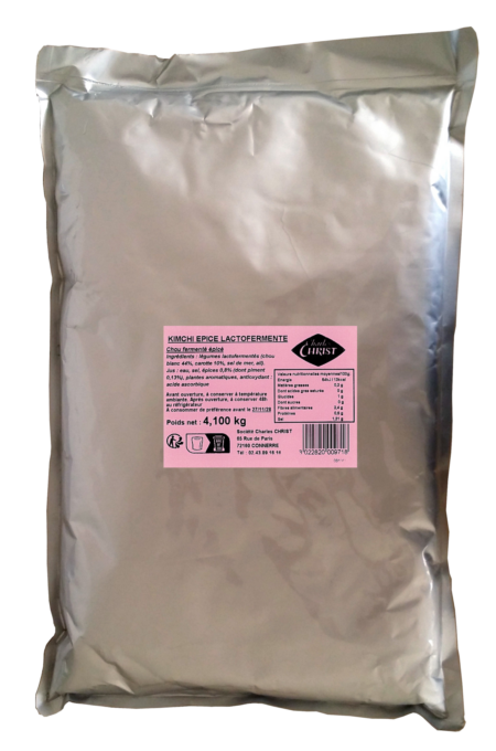Légumes lactofermentés (chou blanc 44%, carotte 10%, sel de mer, ail). Jus : eau, sel, épices 0,8% (dont piment 0,13%), plantes aromatiques, antioxydant : acide ascorbique.